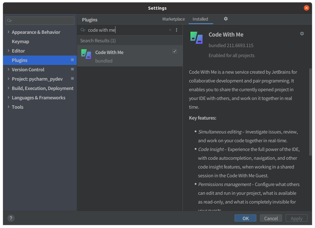 PyCharm plugin conflict Code With Me / Kite